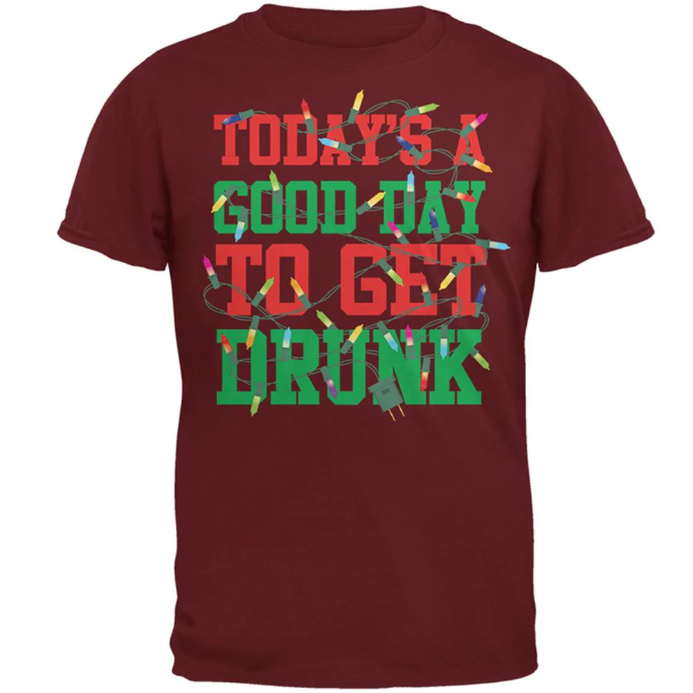 Celebrate Christmas with this funny tee. This Old Glory design is printed on a 100% cotton men's t-shirt. Featuring the text "Today's a good day to get drunk" within a graphic of tangled christmas lights.