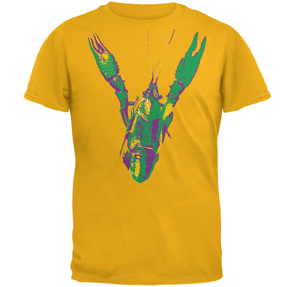 Celebrate Mardi Gras with this 100% cotton mens t-shirt. Featuring a Mardi Gras colored crawfish design.