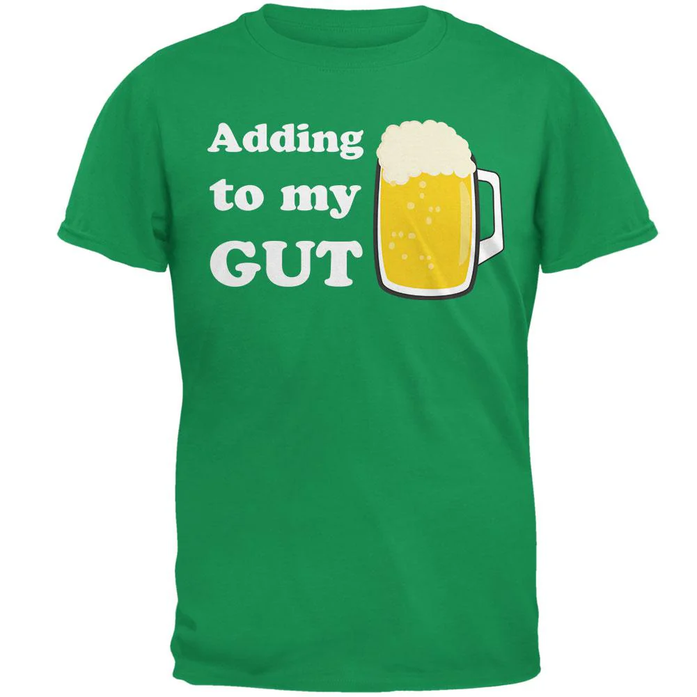 Celebrate your beer belly this St Patricks Day with this 100% cotton men's t-shirt. Featuring the text "Adding to my beer gut" with a beer stein graphic.